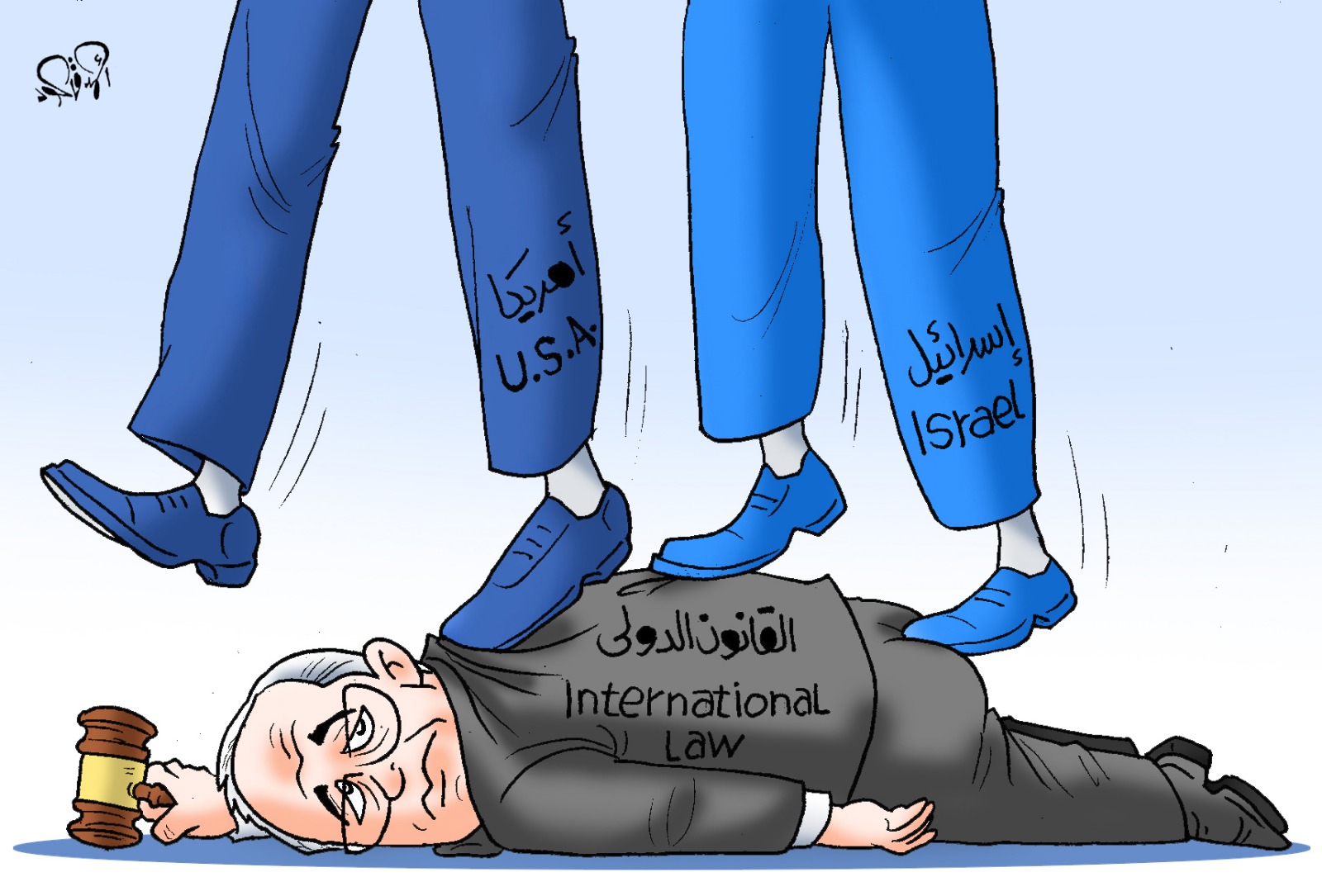 القانون الدولى تحت أقدام أمريكا وإسرائيل فى كاريكاتير
